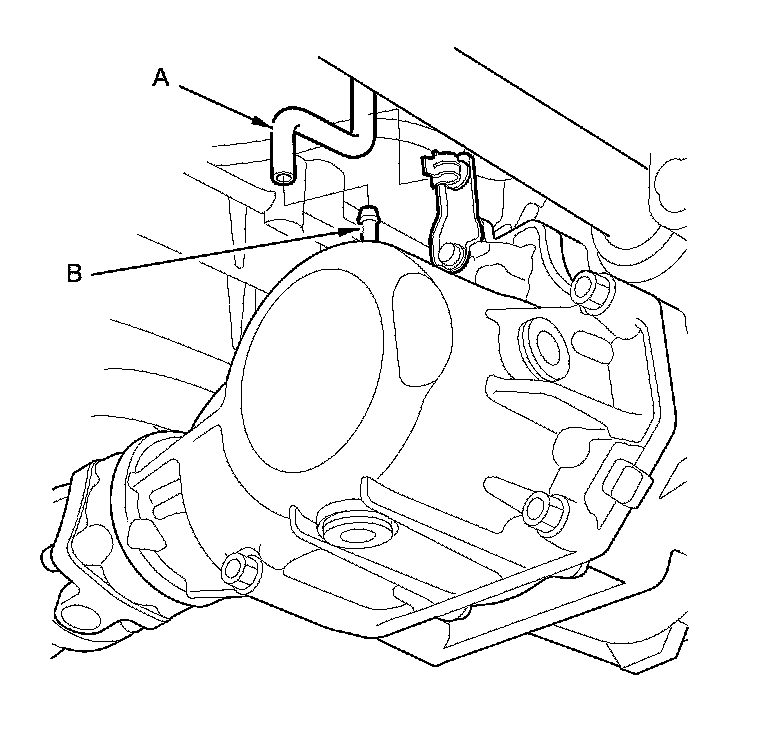 7. Disconnect the breather hose (A) from the breather pipe (B) on the transfer assembly.