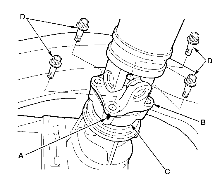 8. Make a reference mark (A) across the No. 1 propeller shaft (B) and the transfer companion flange (C), then remove the bolts (D). Separate the No. 1 propeller shaft from the transfer companion flange.
