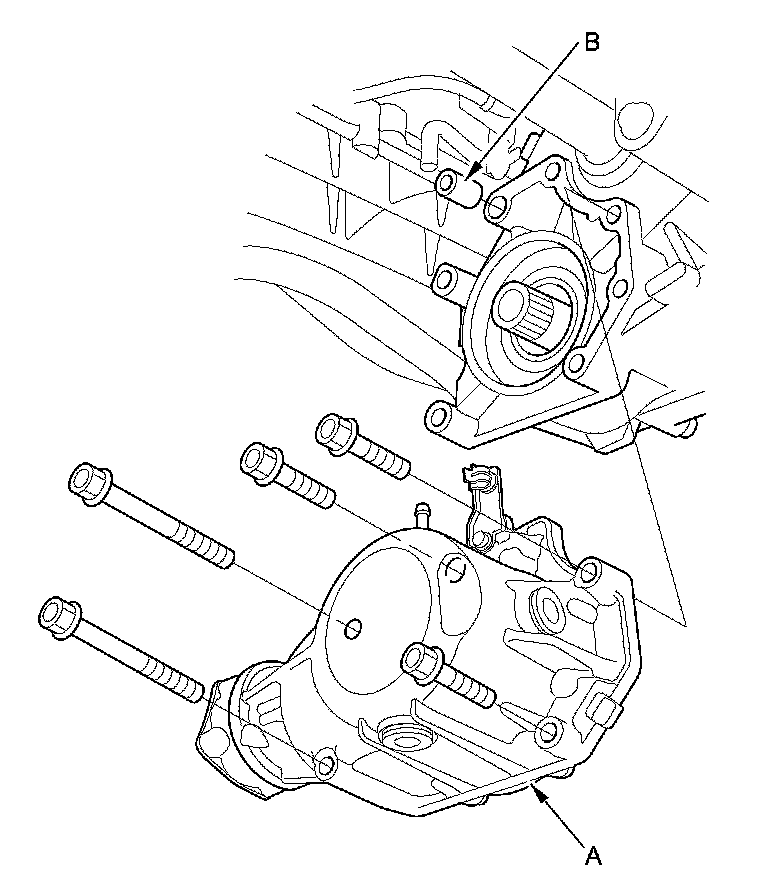 9. Remove the transfer assembly (A) and the dowel pin (B) from the transmission.