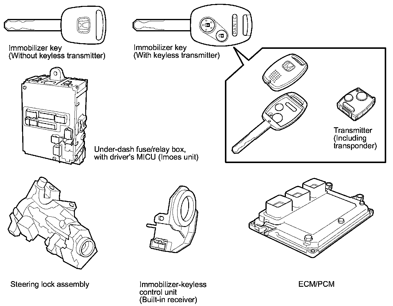 When the immobilizer key (programmed by the HDS) is inserted into the ignition switch and turned to ON (II), the immobilizer-keyless control unit sends a signal to the transponder. The transponder then sends a coded signal back to the immobilizer-keyless control unit which then sends a coded signal to the ECM/PCM and the MICU (imoes unit).