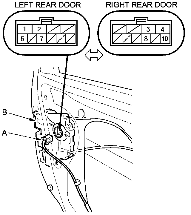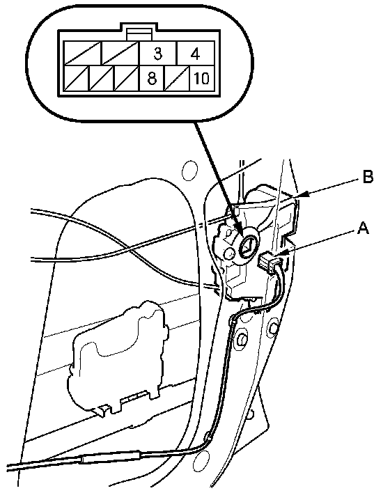 2. Disconnect the 10P connector (A) from the door latch (B).