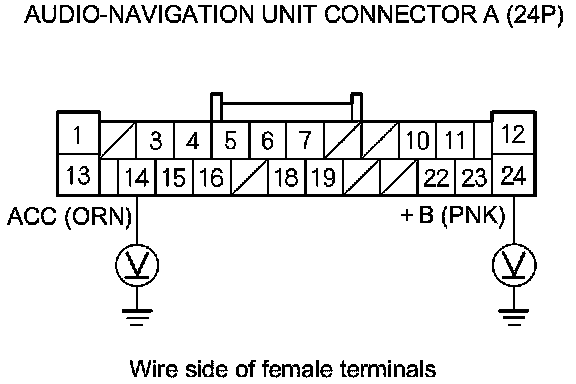 If the +B wire does not have voltage, repair open in the wire between the under-dash fuse/relay box and audio-navigation unit connector A (24P). If the ACC wire does not have voltage, repair open in the wire between the driver's under-dash fuse/relay box and audio-navigation unit connector A (24P).�