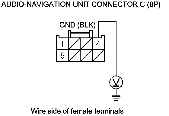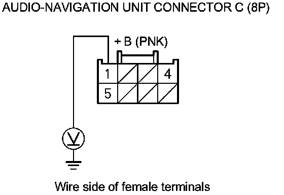 5. Measure the voltage between audio-navigation unit connector C (8P) terminal No. 1 and body ground.