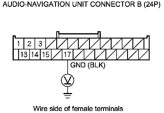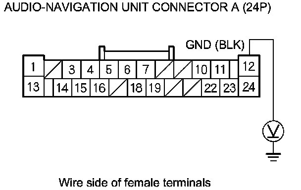 4. Measure the voltage between body ground and audio-navigation unit connector A (24P) terminals No. 14 and No. 24 individually.