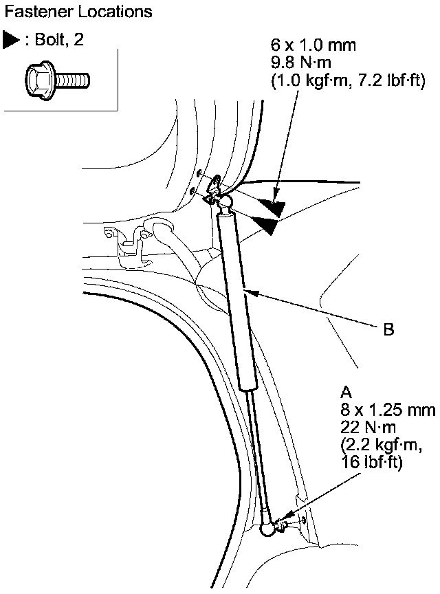 2. Remove the bolts, then remove the support strut (B) from the tailgate.