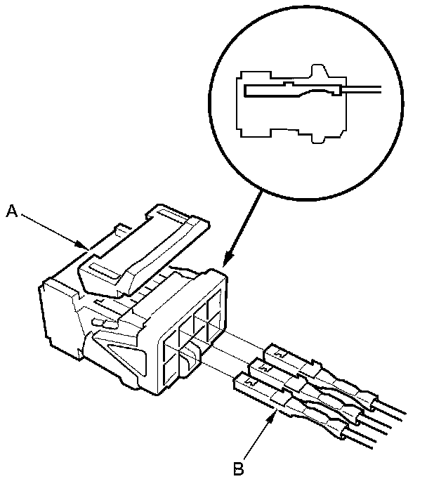 3. Disassemble the power mirror connector (A), and remove the terminals (B) from the connector.