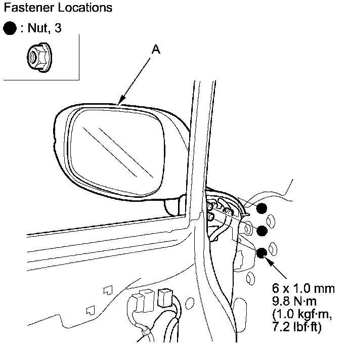 5. While holding the mirror (A), remove the nuts.