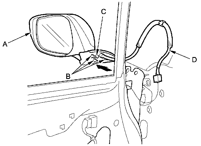 6. Remove the mirror (A) by pulling the threaded studs (B), the screw (C), and the wire harness (D) out through the holes in the door. Take care not to scratch the door or the mirror.