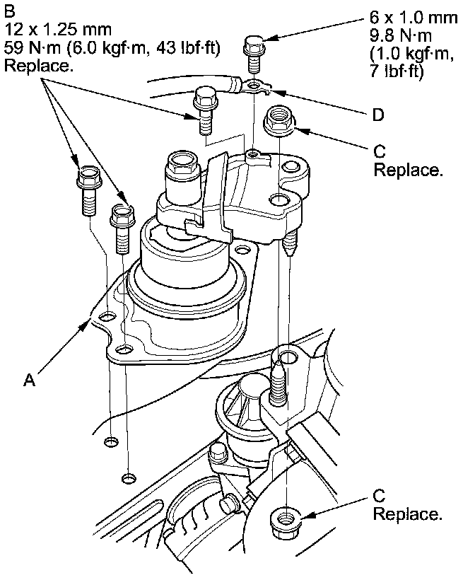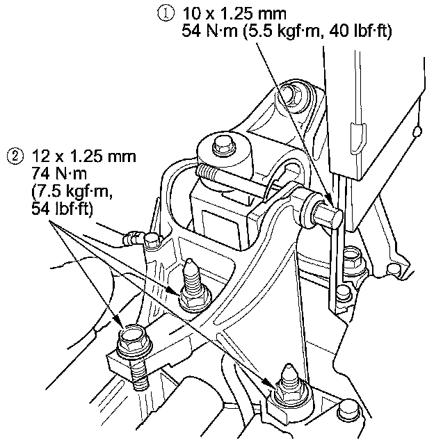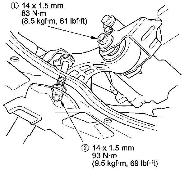 - Reinstall the mounting bolts and support nuts in the sequence given in the following steps. Failure to follow this sequence may cause excessive noise and vibration, and reduce engine mount life.