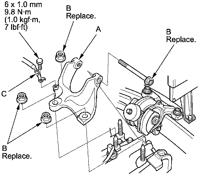 5. Install the transmission mount bracket (A), and loosely install the new transmission mount bracket mounting bolts and nuts (B).