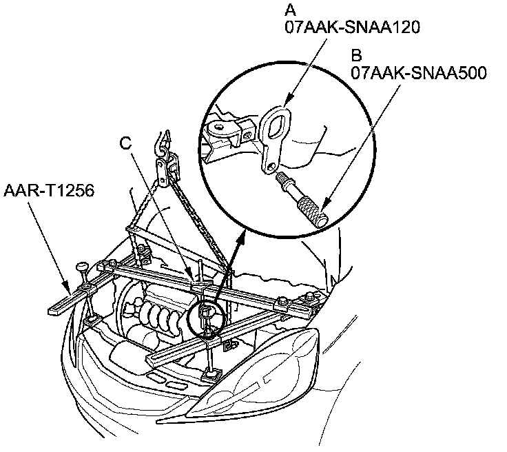 8. Install the engine support hanger (AAR-T1256), then attach the hook to the slotted hole in the second universal lifting eyelet. Tighten the wing nut (C) by hand to lift and support the engine/transmission.