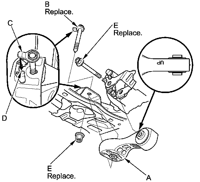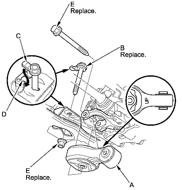 17. Install the torque rod (A). Install the new bolt (B) with the tab (C) on the bolt head aligned with the guide (D) on the front subframe, then loosely install the new torque rod mounting bolt and nut (E).
