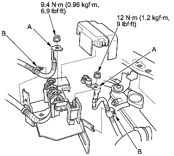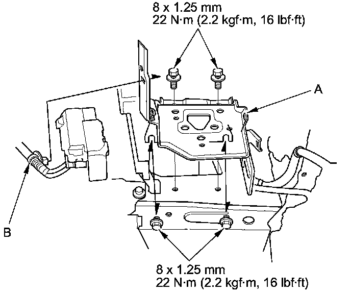 2. Install the side engine mount/bracket assembly (A), then tighten the new side engine mount/bracket assembly mounting bolts (B).