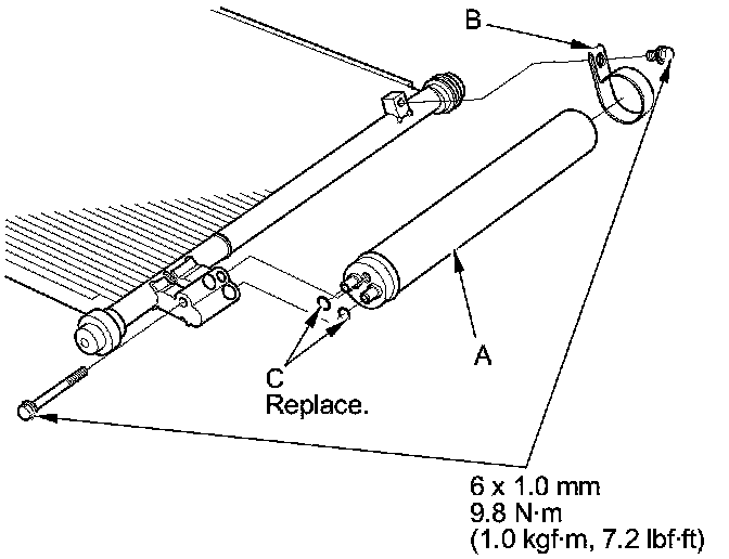 2. Remove the bolts from the A/C condenser, then remove the receiver/dryer (A), the bracket (B), and the O-rings (C).