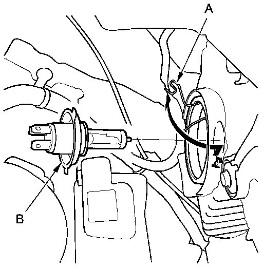 2. Pull the retaining spring (A) away from the bulb (B), then remove the bulb.
