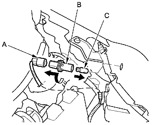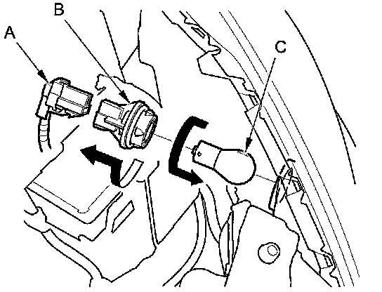 2. Turn the bulb socket (B) 45 ° counterclockwise to remove the bulb (C) from the headlight housing.