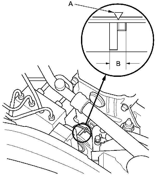 2. Check that the position of the auto-tensioner indicator's pointer (A) is within the standard range (B) as shown. If it is out of the standard range, replace the drive belt Service and Repair.
