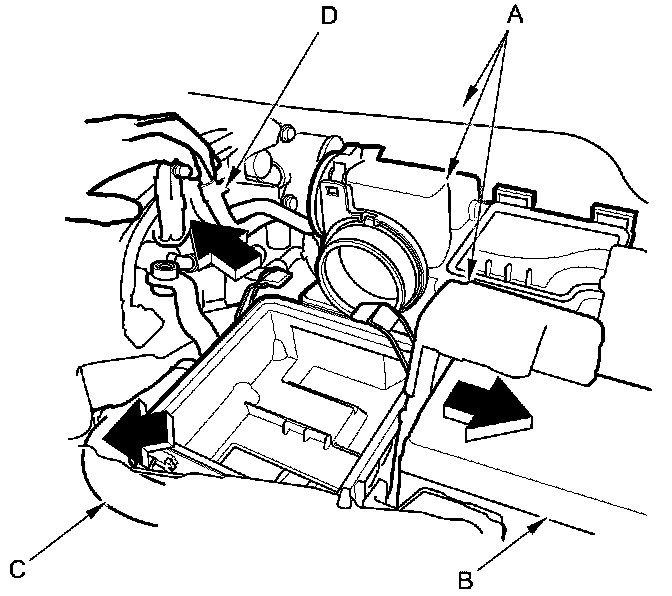 4. Remove the battery hold down, and reposition the battery (B). Reposition the radiator upper hose (C), and the breather pipe (D) as shown.
