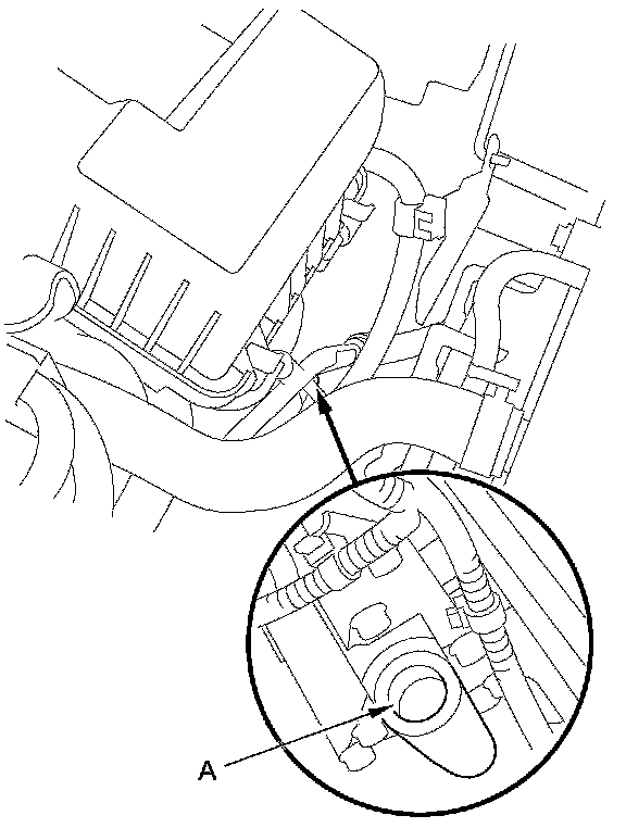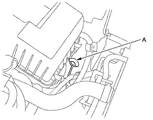 8. If necessary, fill the transmission with the ATF through the dipstick guide opening (A) to bring the fluid level midway between the upper mark and lower mark of the dipstick. Do not fill past the upper mark. Always use Honda ATF DW-1 Automatic Transmission Fluid (ATF). Using a non-Honda ATF can affect shift quality.