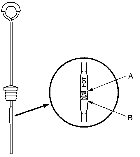 5. Remove the dipstick and check the fluid level. It should be between the upper mark (A) and lower mark (B).