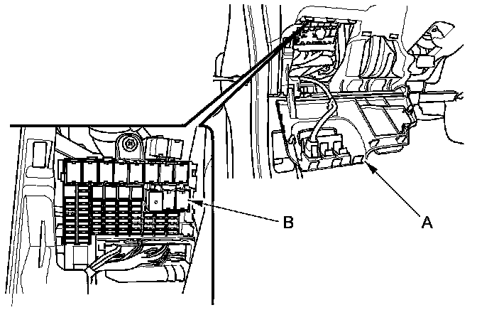 67. Open the fuse access panel (A), then remove PGM-FI main relay 1 (B) from the under-dash fuse/relay box.