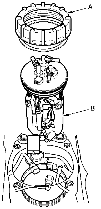 8. Remove the locknut (A) and the fuel tank unit (B).