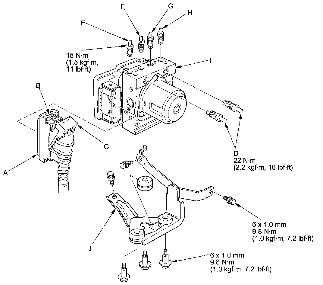 5. Remove the VSA modulator-control unit (I) with the bracket (J) from the body.