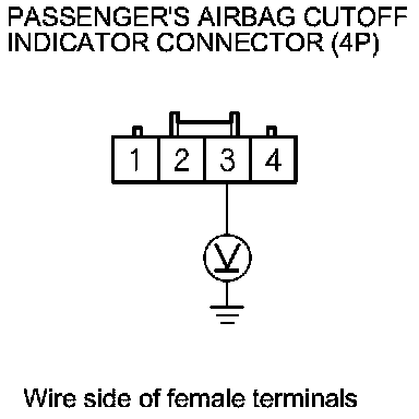 3. Measure the voltage between passenger's airbag cutoff indicator 4P connector terminal No. 3 and body ground. There should be battery voltage.