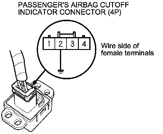 5. Install a jumper wire between passenger's airbag cutoff indicator connector (4P) terminal No. 2 and body ground. The indicator should come on.