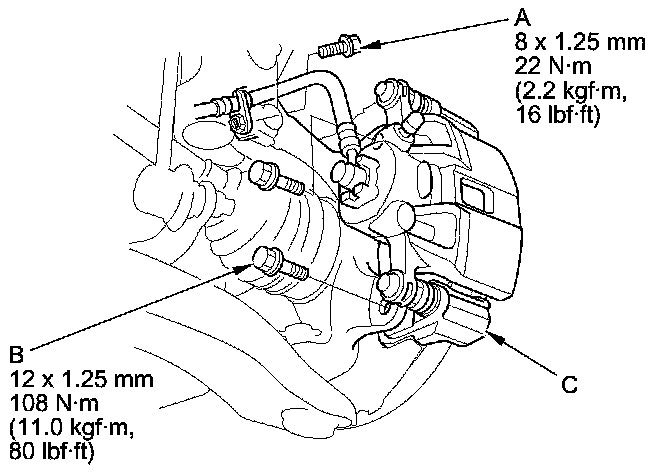 4. Remove the brake caliper bracket mounting bolts (B), then remove the caliper assembly (C) from the knuckle. To prevent damage to the caliper assembly or the brake hose, use a short piece of wire to hang the caliper assembly from the undercarriage. Do not twist the brake hose excessively.