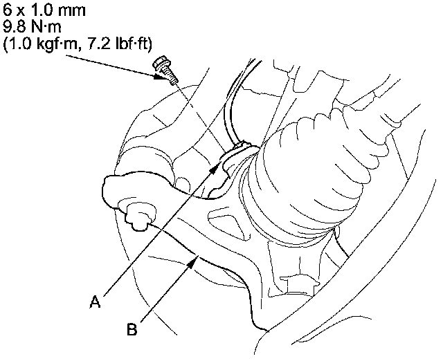 8. Remove the wheel speed sensor (A) from the knuckle (B). Do not disconnect the wheel speed sensor connector.