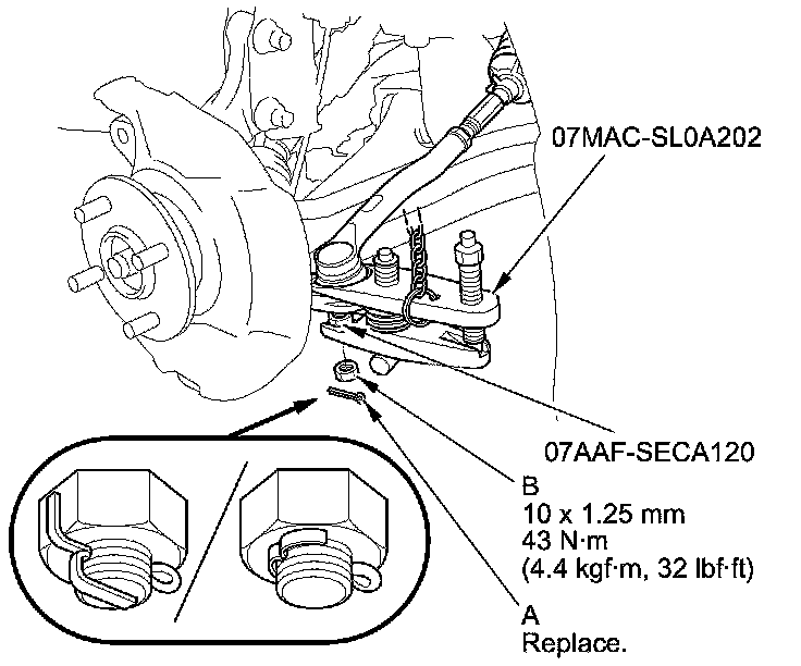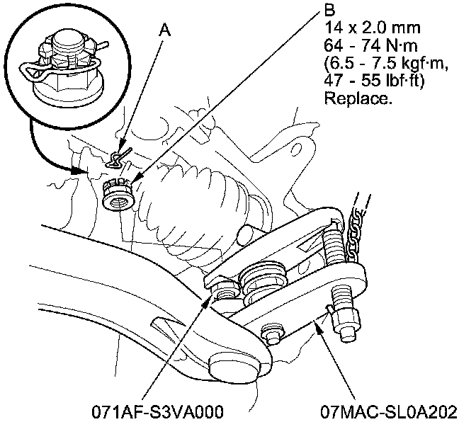 11. Remove the lock pin (A) from the lower arm ball joint, then remove the castle nut (B).