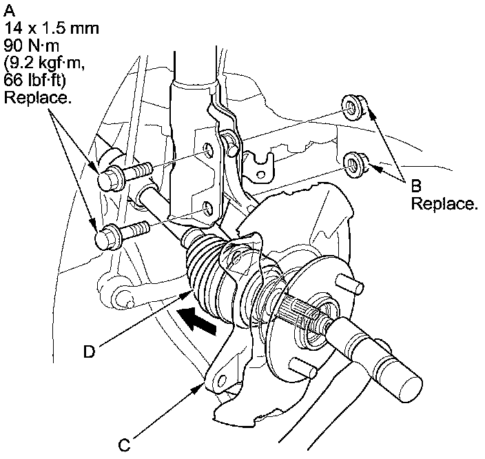 14. Pull the knuckle (C) outward, and separate the outboard joint (D) from the front hub using a soft face hammer.