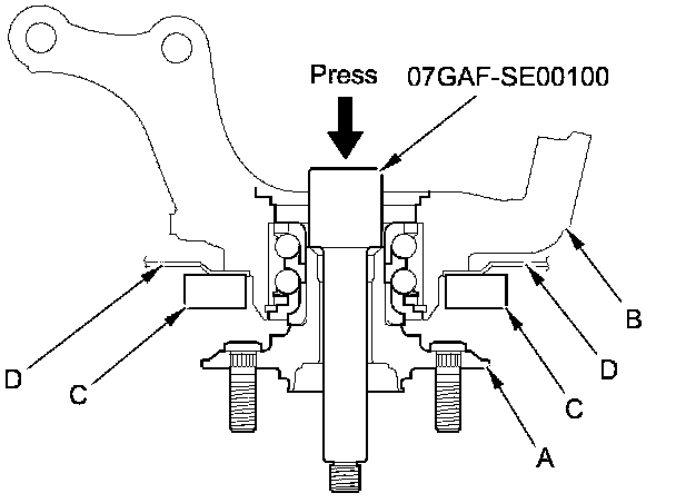 1. Separate the hub (A) from the knuckle (B) using the hub dis/assembly tool and a hydraulic press. Hold the knuckle with the attachment (C) of the hydraulic press or equivalent tool. Be careful not to damage or deform the splash guard (D). Hold onto the hub to keep it from falling when pressed clear.