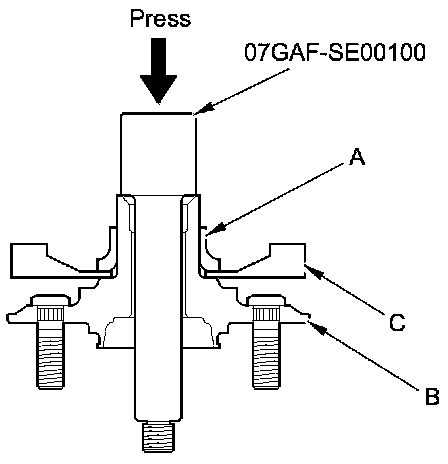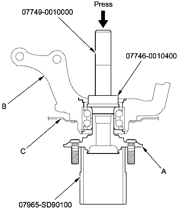 9. Install the hub (A) onto the knuckle (B) using the bearing driver attachment, the driver handle, the support base, and a hydraulic press. Be careful not to damage the splash guard (C).