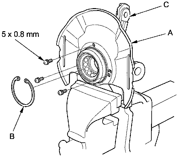 3. Remove the splash guard (A) and the snap ring (B) from the knuckle (C).