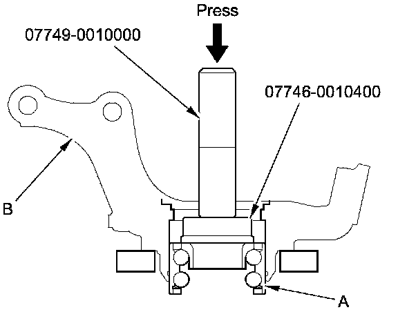 4. Press the wheel bearing (A) out of the knuckle (B) using the bearing driver attachment, the driver handle, and a press.