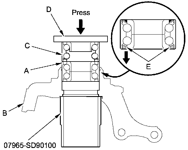 6. Press a new wheel bearing (A) into the knuckle (B) using the old bearing (C), a steel plate (D), the support base, and a press.