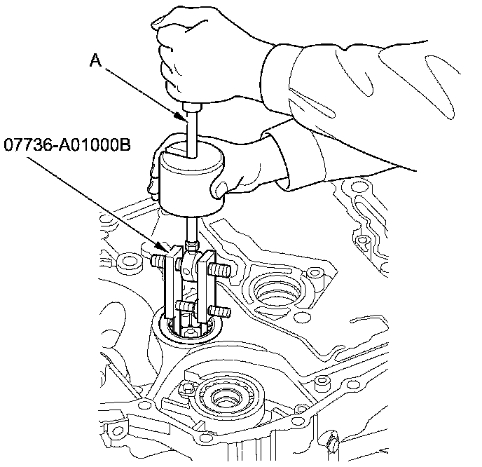 1. Remove the countershaft bearing using the adjustable bearing puller (20-40 mm) and a commercially available 3/8"-16 slide hammer (A).