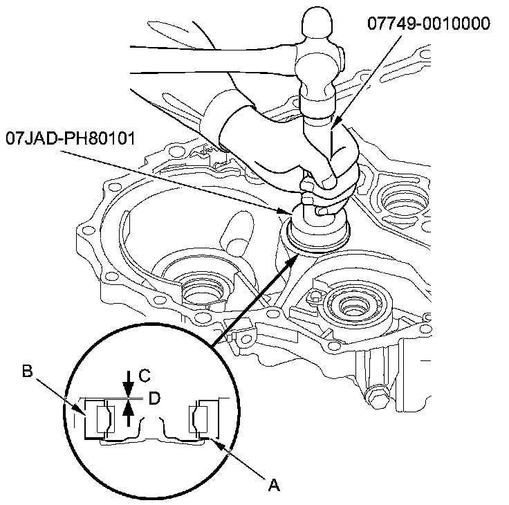 3. Install the new countershaft bearing (B) in the housing using the driver handle and the oil seal driver attachment (58 mm); install the bearing outer race surface in height (C) of 0-0.03 mm (0-0.001 in) above the housing surface (D). Do not install the bearing exceeding 0.03 mm (0.001 in) high from housing surface.