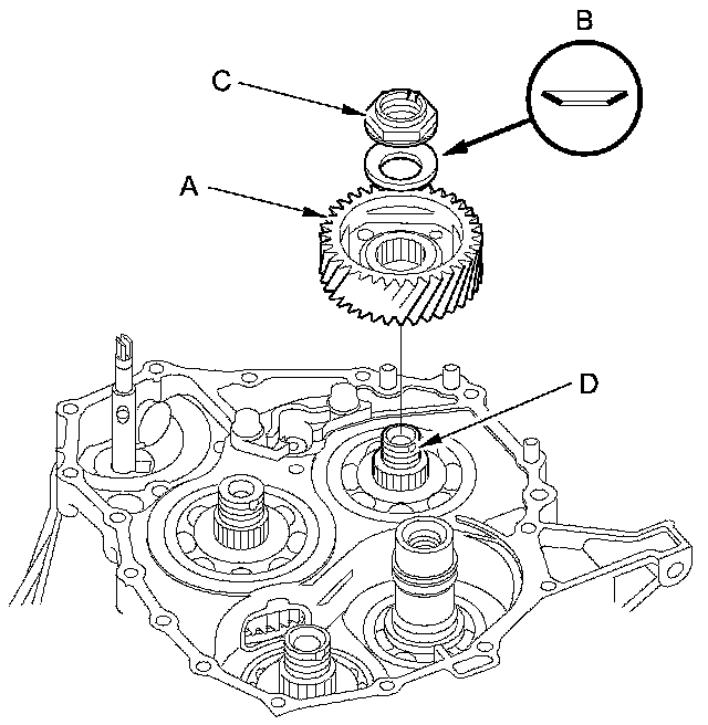 3. Install the mainshaft idler gear (A), the old conical spring washer (B), and the old locknut (C) on the mainshaft (D), and tighten the locknut to 216 Nm (22.0 kg-m, 159 lb-ft).