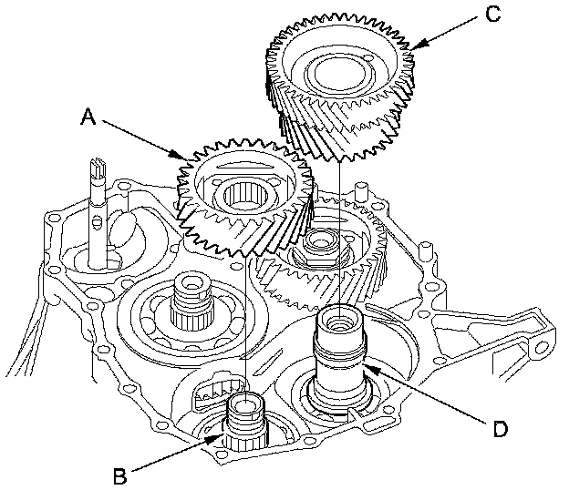 5. Install the secondary shaft idler gear (A) on the secondary shaft (B), and install the idler gear shaft idler gear (C) on the idler gear shaft (D).