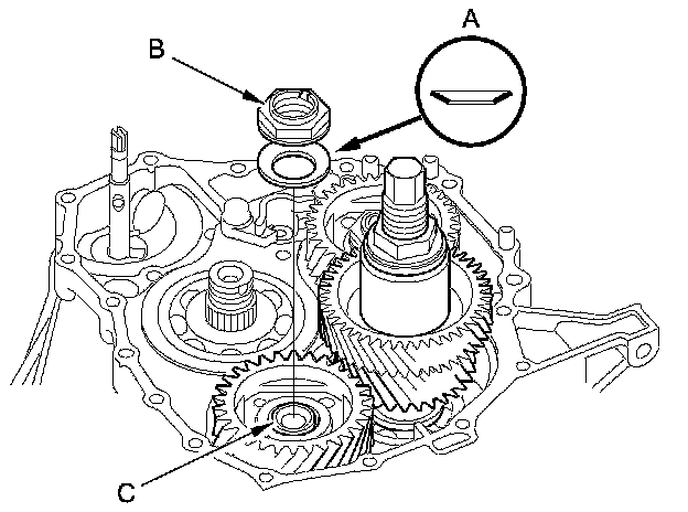 7. Install the old conical spring washer (A) and the old locknut (B) on the secondary shaft (C), and tighten the locknut to 226 Nm (23.0 kg-m, 166 lb-ft).