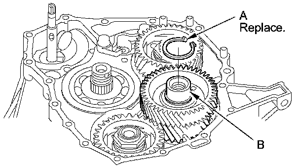 9. Install the new snap ring (A) on the idler gear shaft (B), and verify that the snap ring is seated securely into the groove.