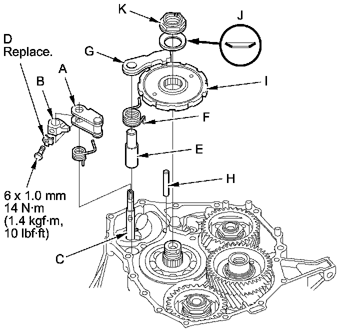 13. Install the park gear (I), the old conical spring washer (J), and the old locknut (K) on the countershaft.