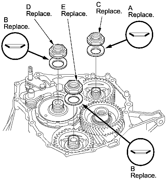 17. Install the new conical spring washers (A) (B) in the direction shown, and install the new mainshaft locknut (C), the new countershaft locknut (D), and the new secondary shaft locknut (E).