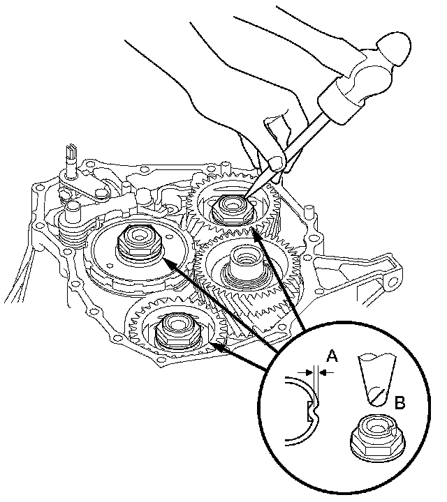 20. Stake the locknuts into the shafts to a depth (A) of 0.7-1.3 mm (0.03-0.05 in) using a 3.5 mm punch (B).