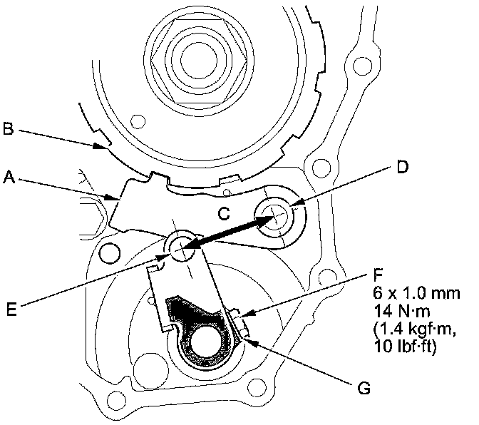 23. Tighten the lock bolt (F), and bend the lock tab of the lock washer (G) against the bolt head.