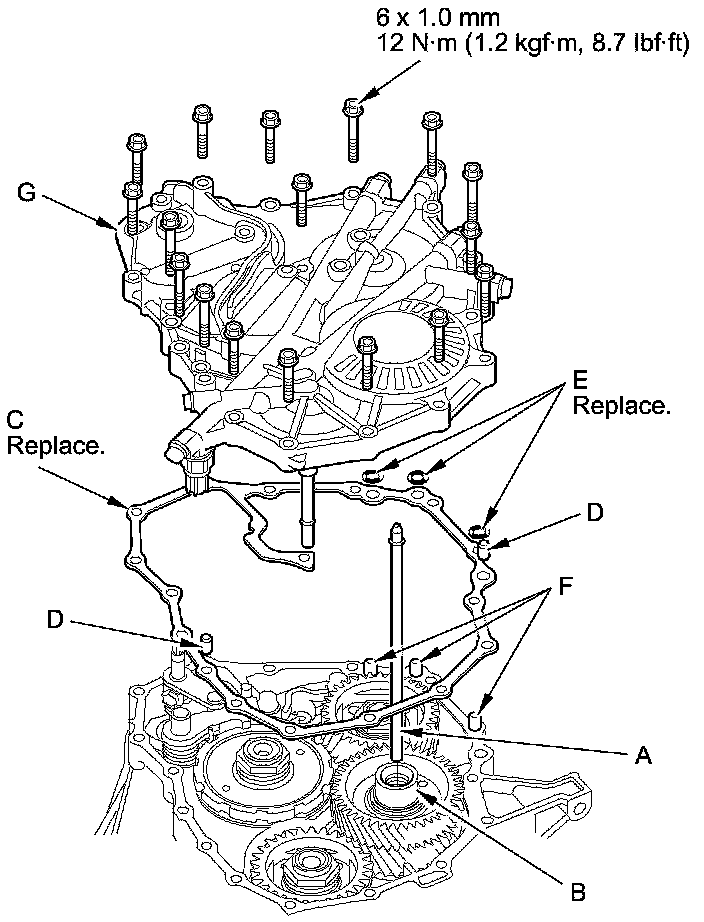 25. Install the new gasket (C) on the transmission housing, and install the two dowel pins (D) and new O-rings (E) over the top of the ATF feed pipes (F).