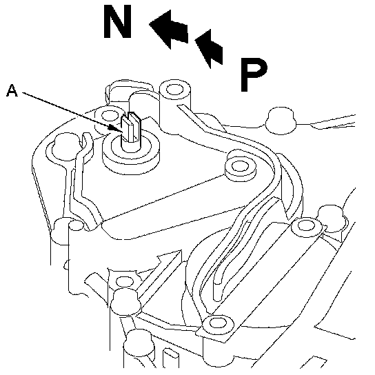27. Using the selector control shaft end on the torque converter housing side, turn the control shaft (A) fully clockwise (view from end cover) to the P position. Turn the control shaft back two click-stopped positions so that it is in the N position.
